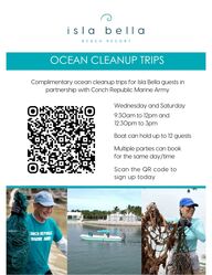 Message Complimentary ocean cleanup trips for Isla Bella guests inpartnership with Conch Republic Marine ArmyWednesday and Saturday9:30am to 12pm and12:30pm to 3pmBoat can hold up to 12 guestsMultiple parties can bookfor the same day/timeOCEAN CLEANUP TRIPSScan the QR code tosign up today